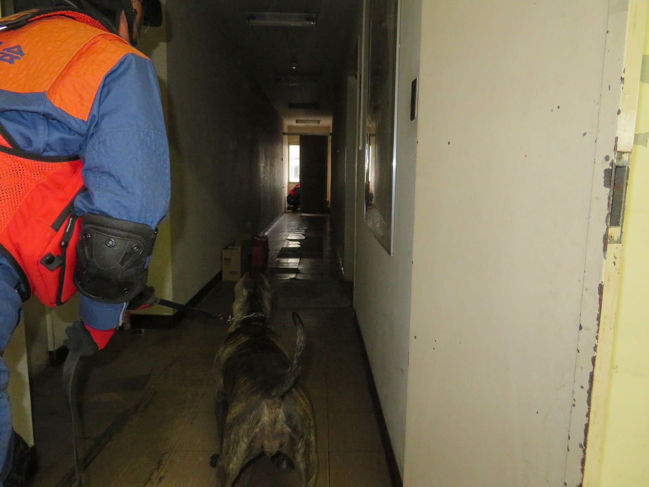 まずは建物内の捜索からスタート、各部屋2頭で確認するも反応なし。