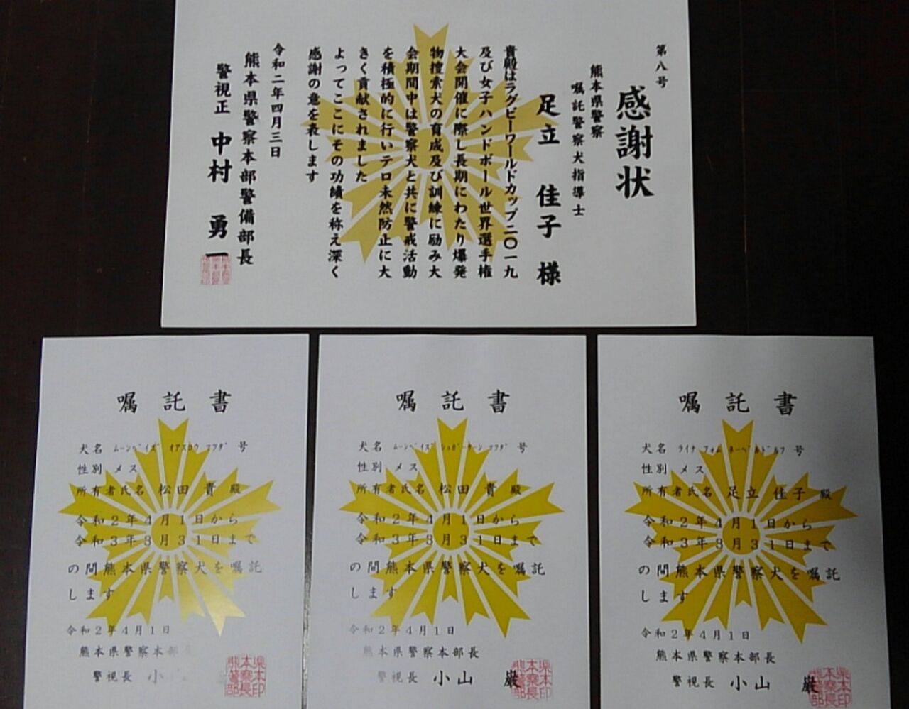 例年は、熊本県警察本部で指導士一同揃い、警察犬同伴で行われる交付式ですが今年は、新型コロナの影響もあり個別の交付式。