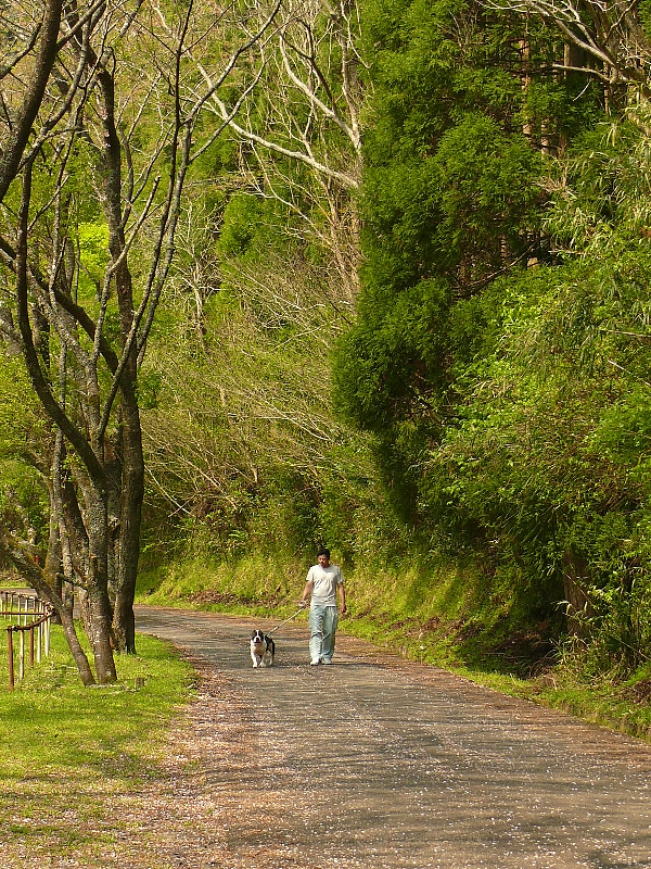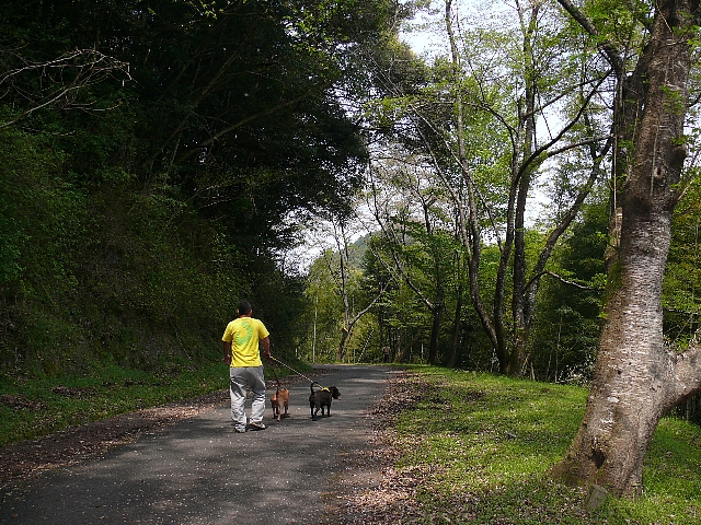 朝方の、山へのお散歩は木陰は涼しく快適な様子です。